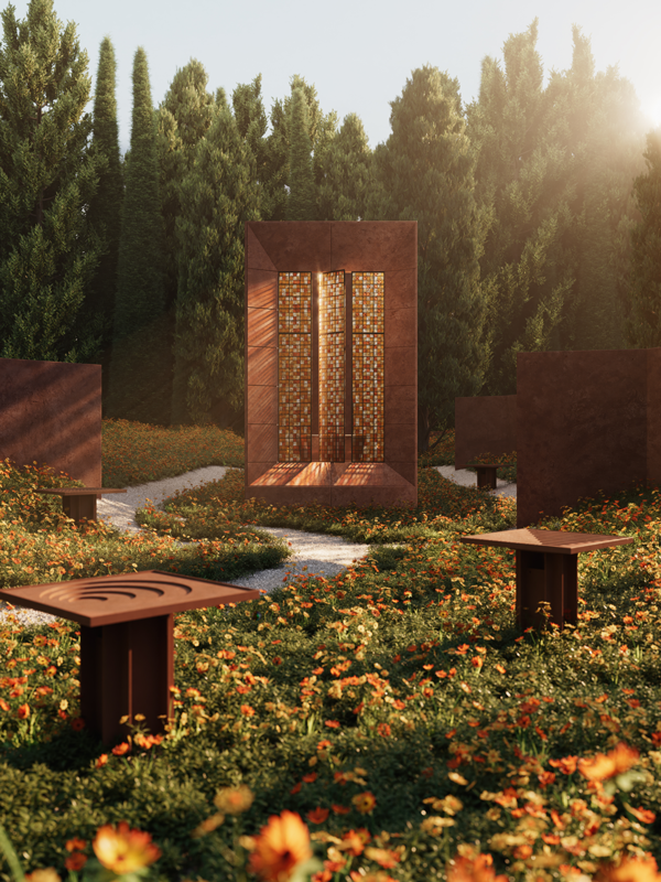 Tác phẩm nghệ thuật bình yên này lấy cảm hứng từ màu sắc của kim loại đã phong hóa và các bề mặt thô sơ, như thể nó nảy sinh một cách tự nhiên từ môi trường xung quanh mà không phải bị áp đặt lên từ tác động bên ngoài. Nổi bật trên một cánh đồng hoa dại hoang sơ, công trình này phản ánh một triết lý thiết kế bắt nguồn từ mối quan hệ qua lại với thiên nhiên.